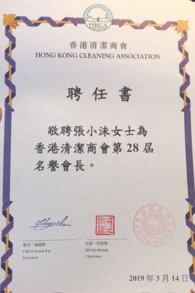 祝賀我司執行董事張小沫女士榮獲香港清潔商會第28屆“榮譽會長”名銜